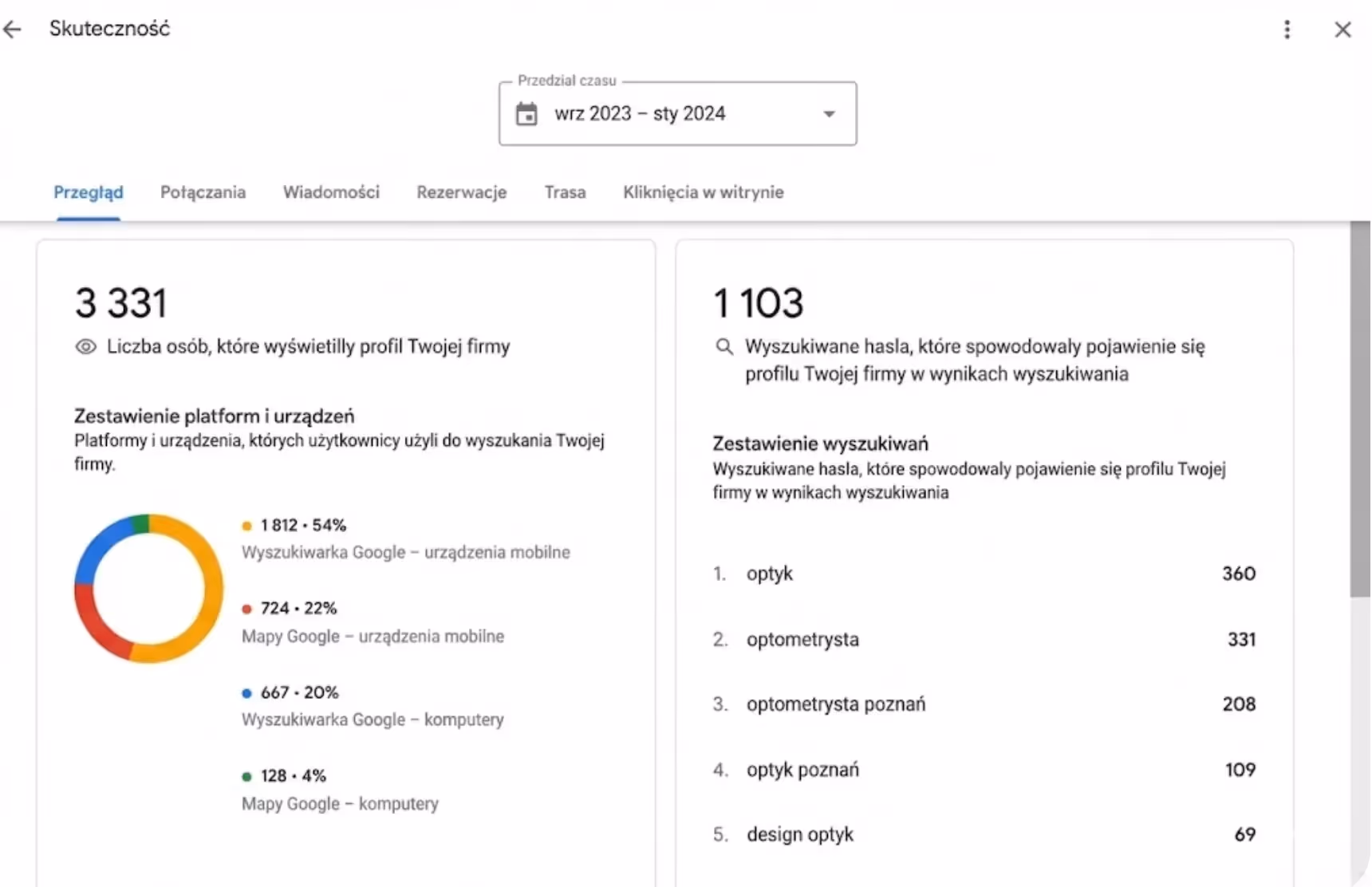 - Intensywne pozyskiwanie opinii klientów - zidentyfikowanie zbyt małej ilości opinii jako kluczowej przyczyny impasu w rankingu na najważniejsze frazy (np. „optyk Poznań”). Po zmobilizowaniu zespołu klienta, szybkie zdobycie kilkunastu pozytywnych opinii spowodowało natychmiastowy wzrost statystyk (wyświetleń, interakcji, połączeń, wskazówek dojazdu, kliknięć w witrynę).