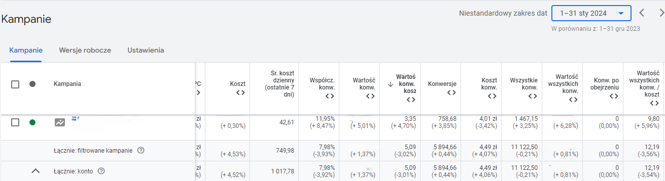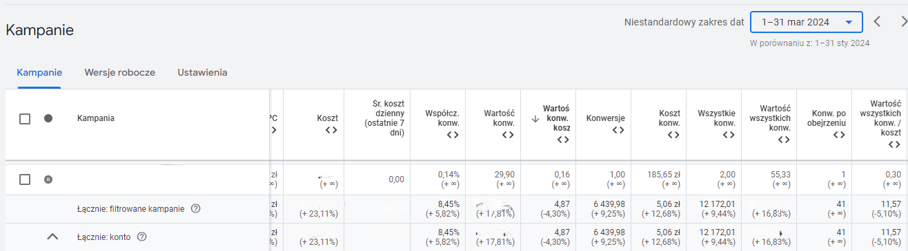 Statystyki obrazują podsumowanie marca z poziomu konta w porównaniu ze styczniem. Wzrost Wartości konwersji o 17,81% przy wzroście kosztów o 23,11% i spadku ROASu tylko o 4,3%