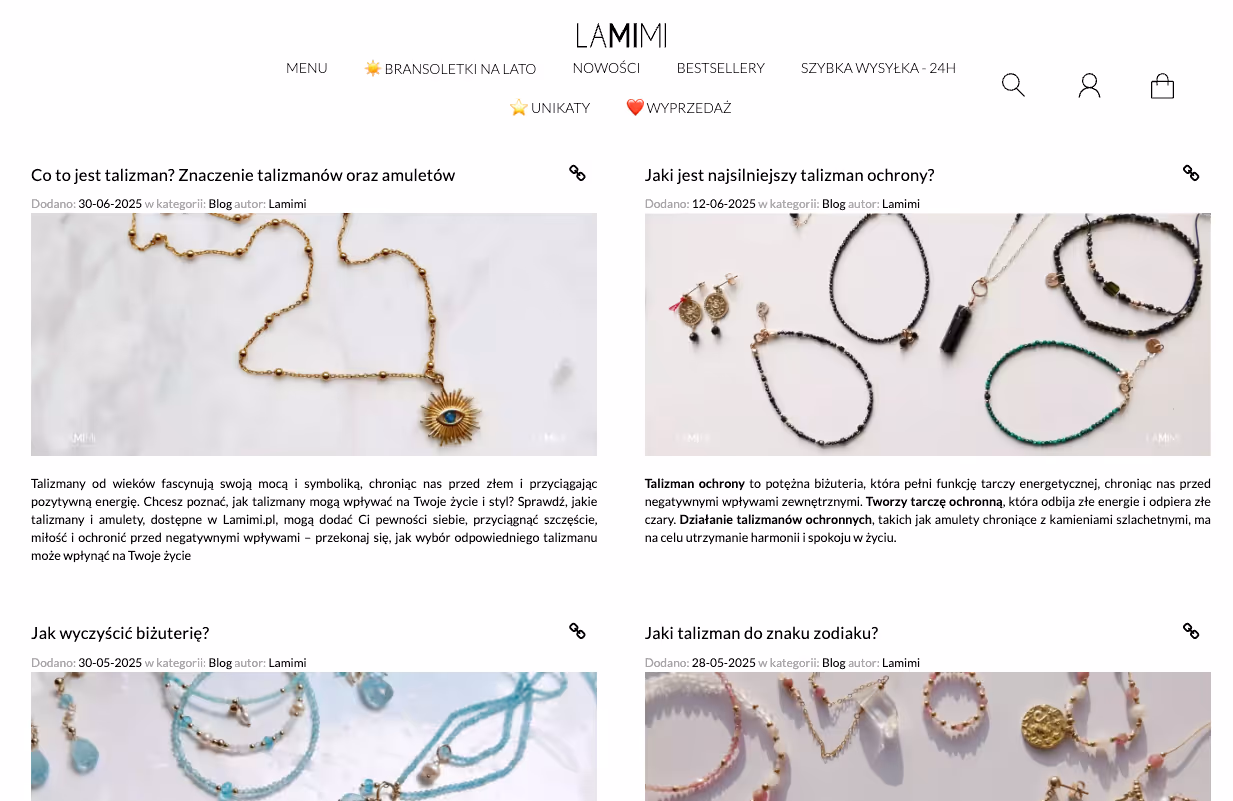 W ramach działań contentowych w pierwszej kolejności stworzyliśmy i regularnie rozbudowywaliśmy bloga. Opublikowaliśmy artykuły odpowiadające na pytania klientów, poradniki, inspiracje oraz treści związane z trendami w biżuterii. Te działania miały na celu pozyskanie ruchu long-tail.