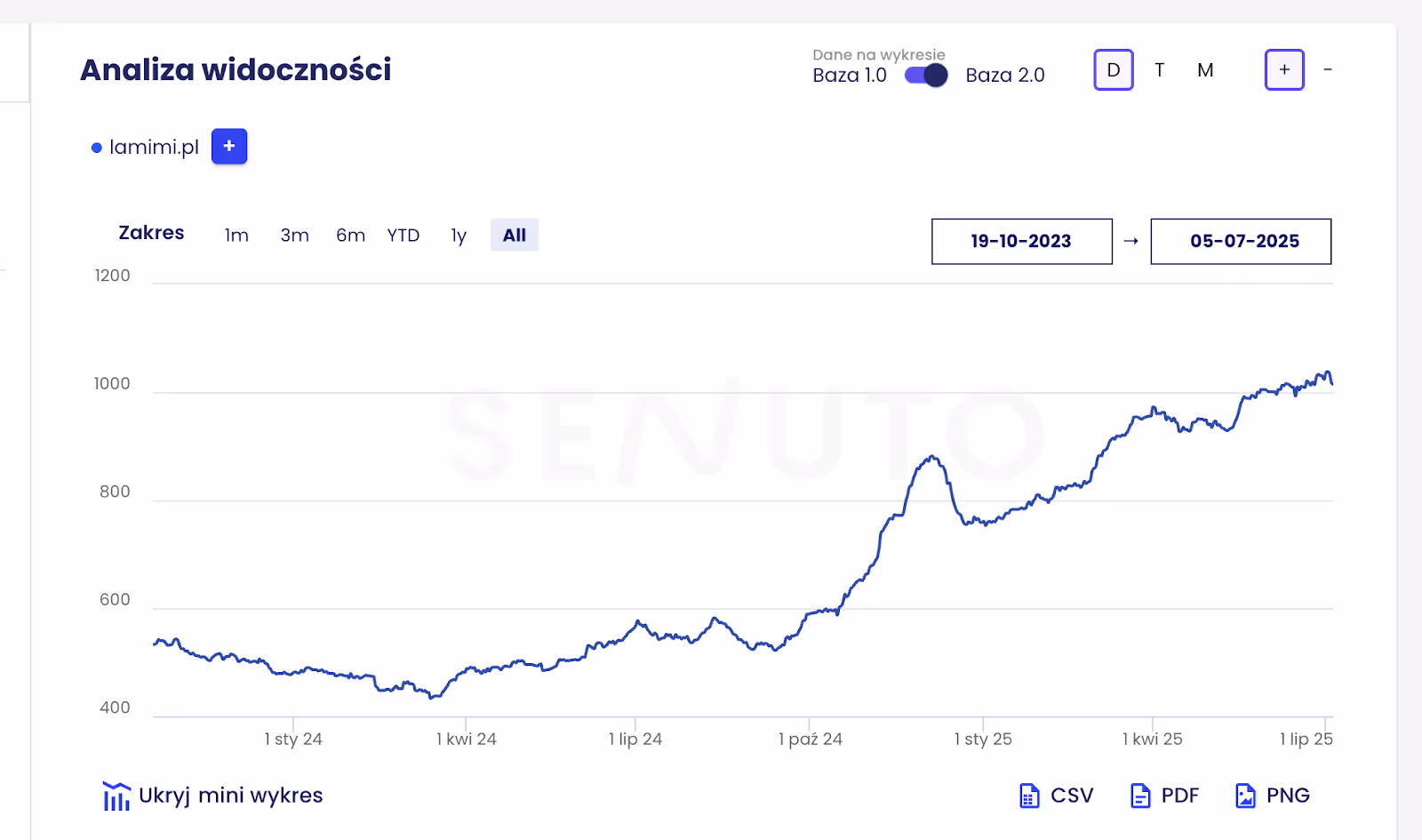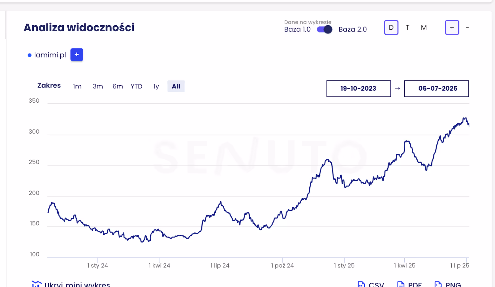 Przed rozpoczęciem naszych działań (lipiec 2023 - kwiecień 2024) - widoczność utrzymywała się na stosunkowo niskim i niestabilnym poziomie - oscylowała w granicach 400-500 punktów (na skali 1200) oraz 100-150 punktów (na skali 350). Widać krótkotrwałe wzrosty i spadki, ale bez wyraźnego trendu. Od momentu przejęcia działań przez nas w kwietniu 2024 roku, obserwujemy spektakularny i niemal nieprzerwany wzrost widoczności.