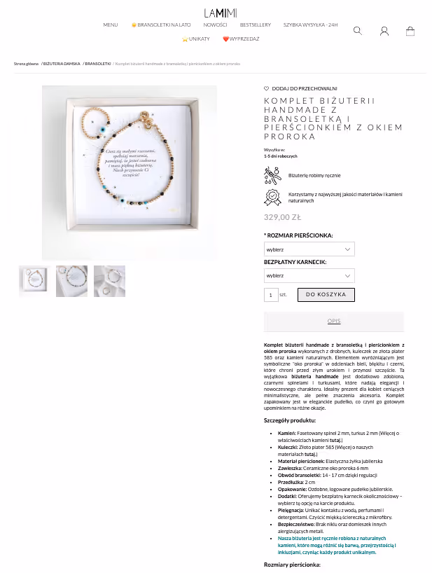 La Mimi to dynamicznie rozwijający się producent wysokiej jakości biżuterii handmade. W swoim sklepie internetowym oferują unikatowe, ręcznie robione ozdoby z kamieni naturalnych i nie tylko, jak bransoletki, naszyjniki, pierścionki czy kolczyki wyróżniające się oryginalnym designem i dbałością o detale. Koncentrują się na dostarczaniu produktów, które łączą rzemieślniczą precyzję z nowoczesnymi i jednoczesnie nietuzinkowymi trendami. Ich celem jest oferowanie biżuterii, która podkreśla indywidualność i styl kobiet w średnim oraz młodym wieku. Marka stawia na jakość materiałów i unikalność każdego egzemplarza.