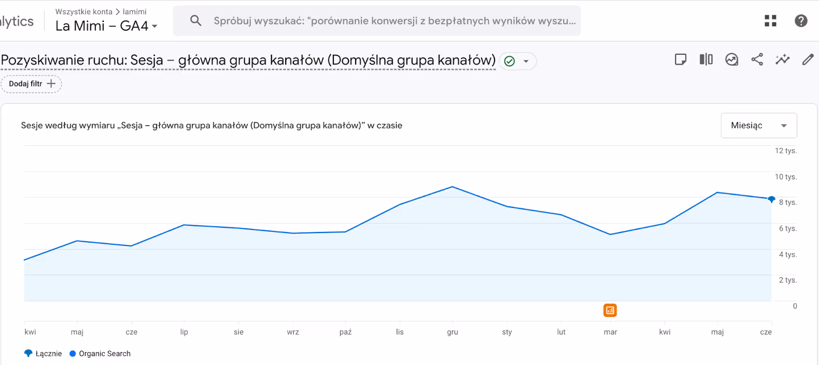 - Grudzień 2023 - duży skok sesji organicznych, przekraczający 8 tys.