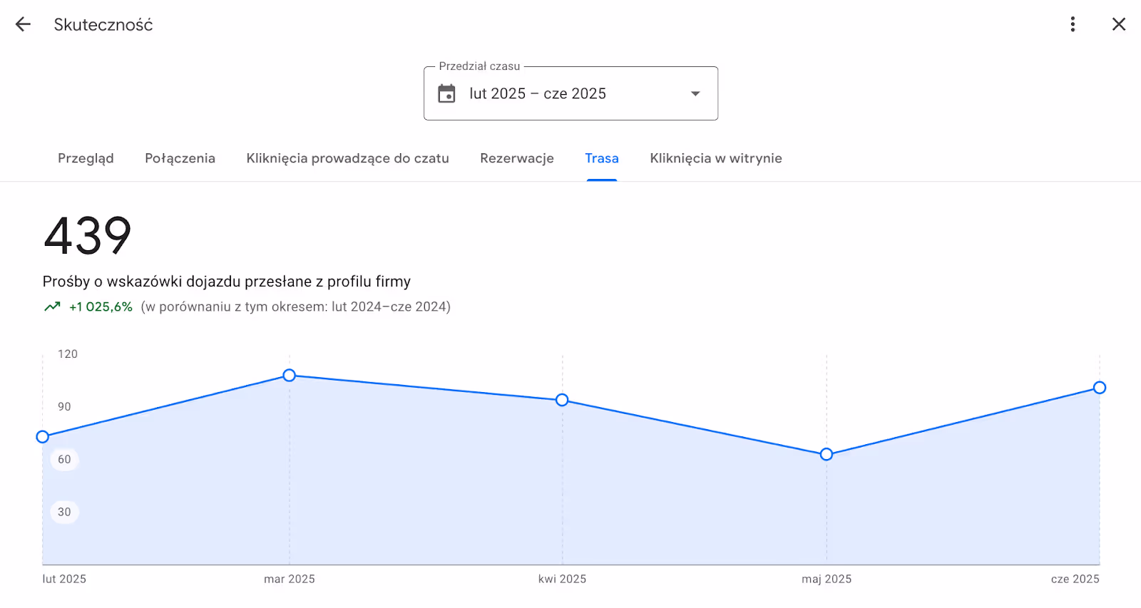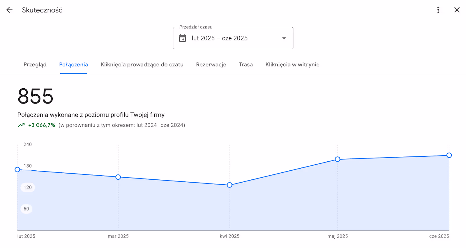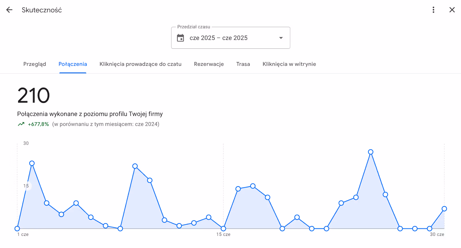 Jeszcze bardziej imponujące są wzrosty dotyczące kontaktów bezpośrednich. Liczba połączeń telefonicznych wykonanych z poziomu profilu Google wzrosła o ponad 670%, co pokazuje, że pacjenci nie tylko odwiedzają profil, ale również aktywnie nawiązują kontakt z przychodnią, stawiając na bezpośrednią komunikację. W czerwcu 2025 udało się przebić magiczną liczbę 200 połączeń do przychodni - gdzie w porównaniu do poprzednich miesięcy było ich średnio 140.