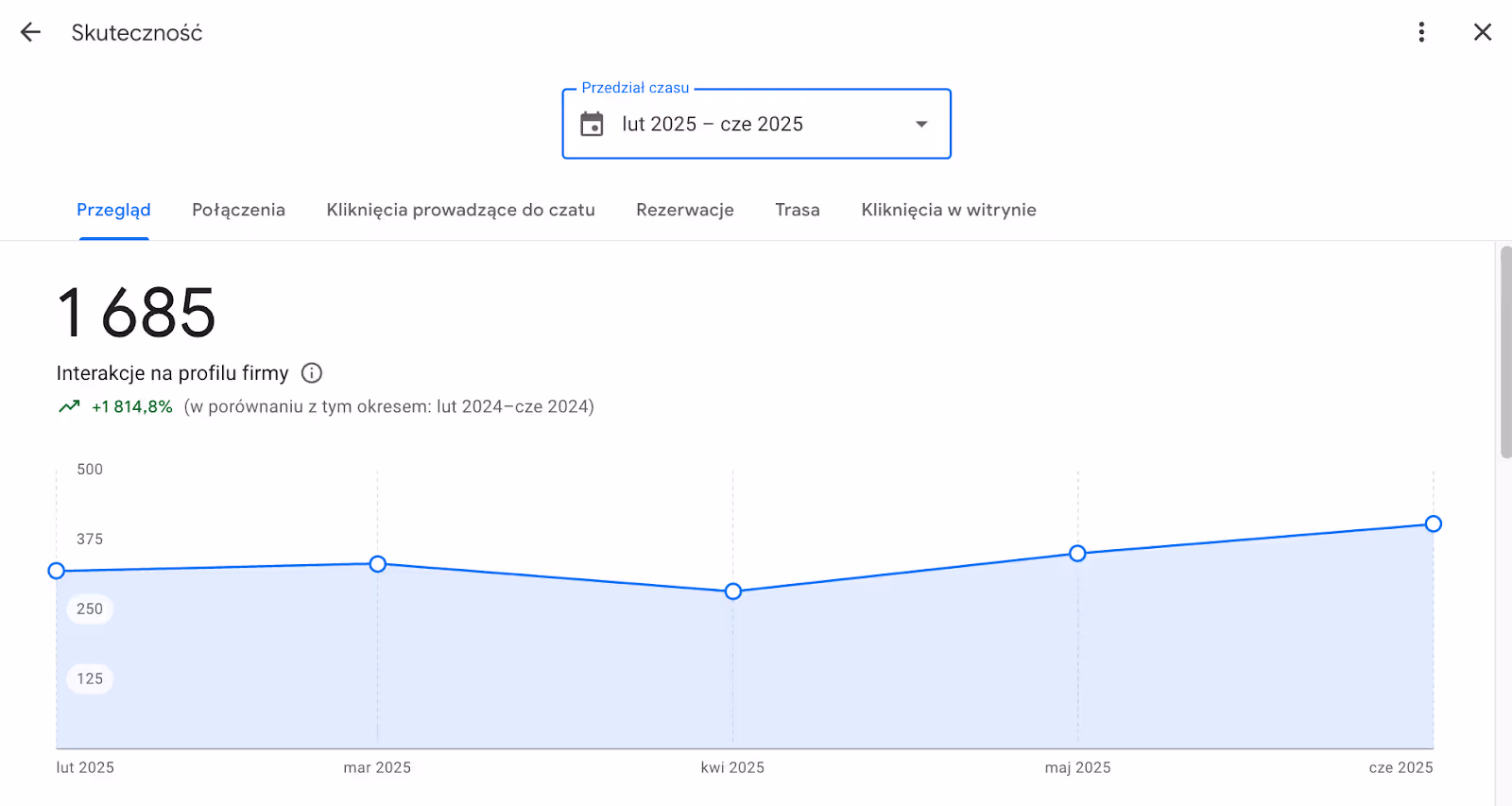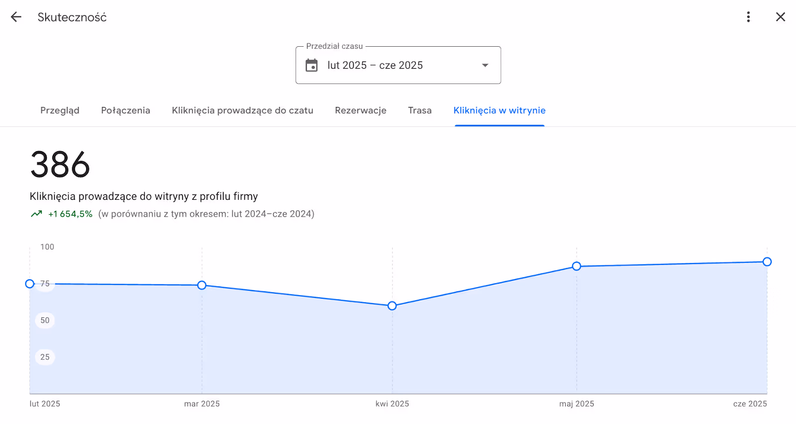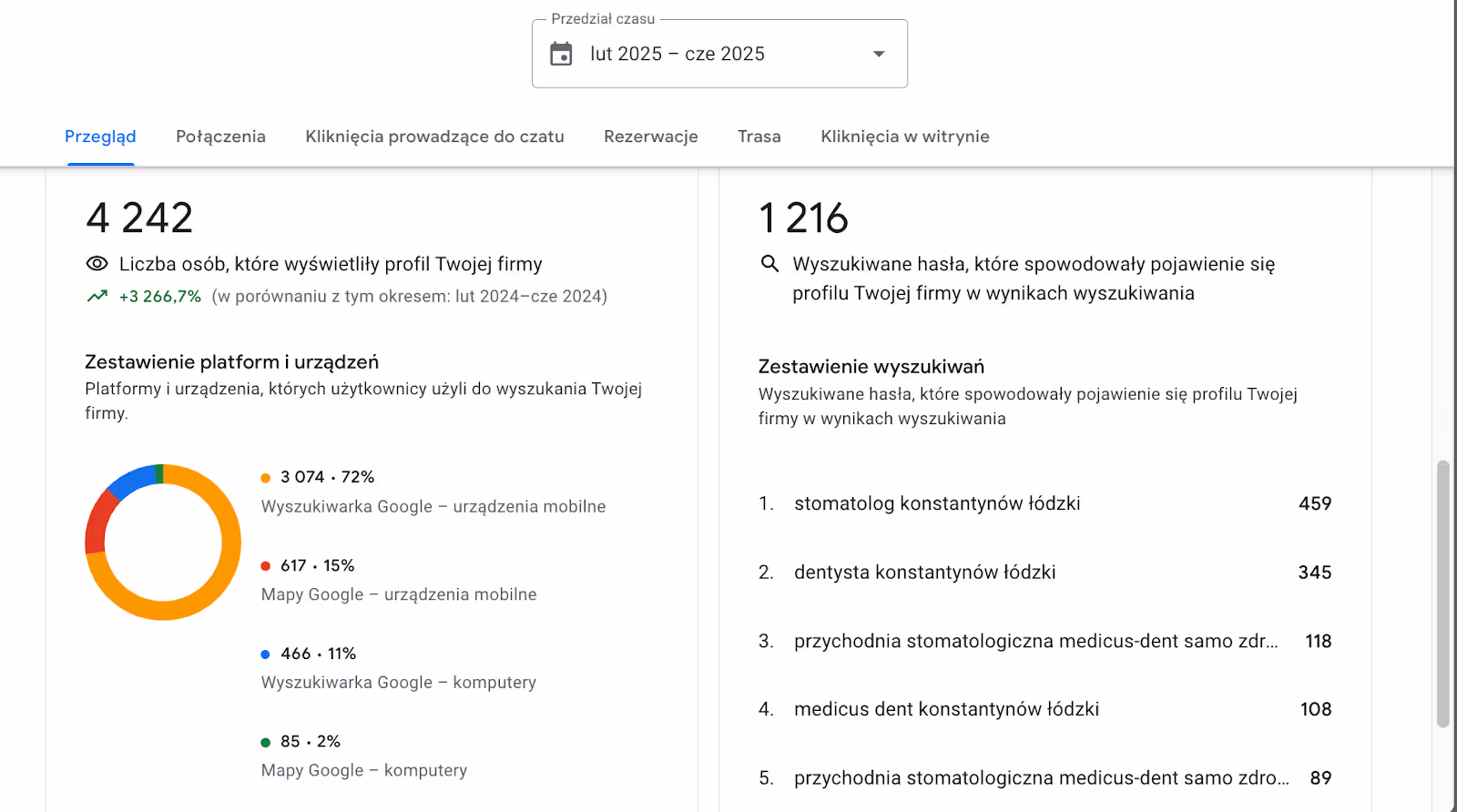 Jeszcze bardziej imponujące są wzrosty dotyczące kontaktów bezpośrednich. Liczba połączeń telefonicznych wykonanych z poziomu profilu Google wzrosła o ponad 670%, co pokazuje, że pacjenci nie tylko odwiedzają profil, ale również aktywnie nawiązują kontakt z przychodnią, stawiając na bezpośrednią komunikację. W czerwcu 2025 udało się przebić magiczną liczbę 200 połączeń do przychodni - gdzie w porównaniu do poprzednich miesięcy było ich średnio 140.