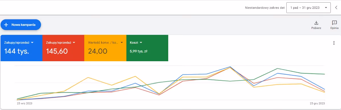 Panel Google Ads od 1.10.23 do 31.12.2023, Zawiera: obrót, ilość konwersji, ROAS, koszt kampanii.