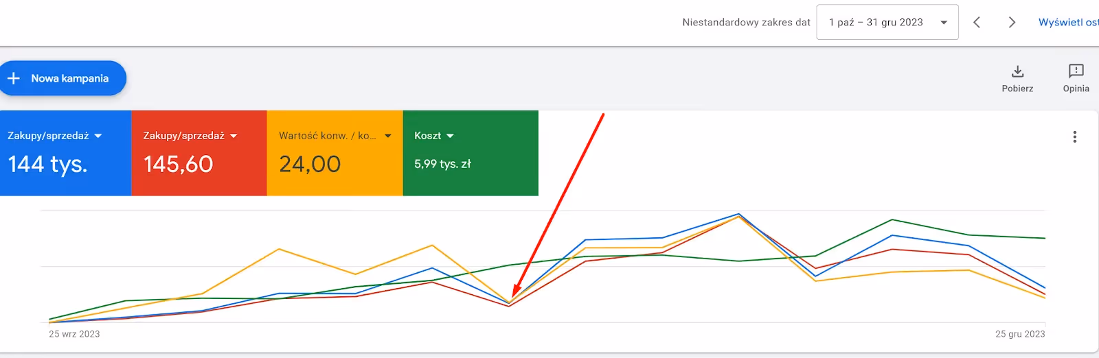 Panel Google Ads od 1.10.23 do 31.12.2023, Zawiera: obrót, ilość konwersji, ROAS, koszt kampanii. Zaznaczony na nim został moment największego spadku na koncie.