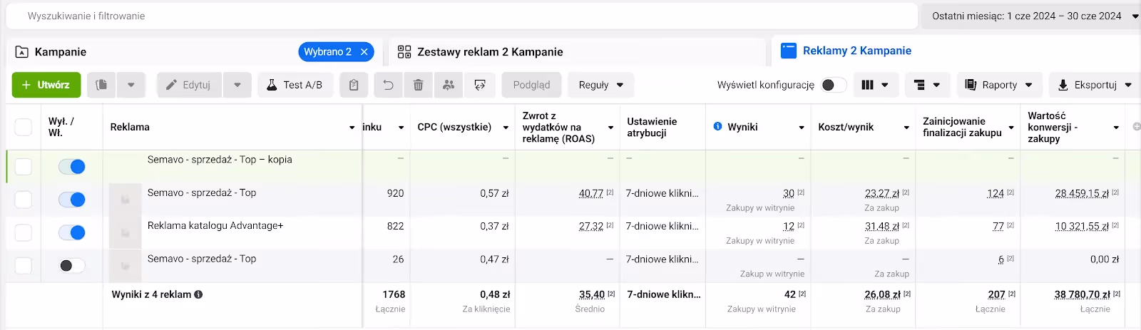 Panel Facebook Ads, przedstawiający kampanię, koszt za kliknięcie, ROAS, ustawienia atrybucji, obrót w danym okresie 01.06.2024 - 30.06.2024