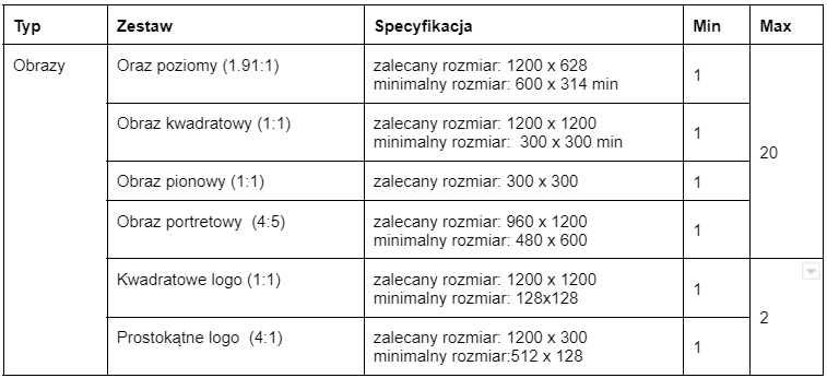 Poniżej są przedstawione wymiary, jakie powinny mieć przesłane zdjęcia, rolki itp. do kampanii reklamowej w Meta Ads: