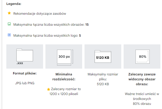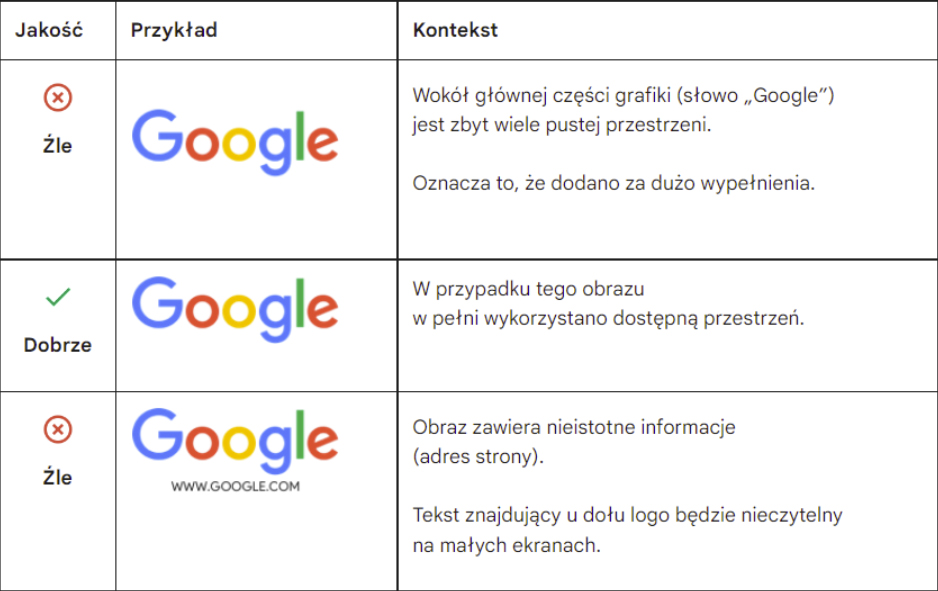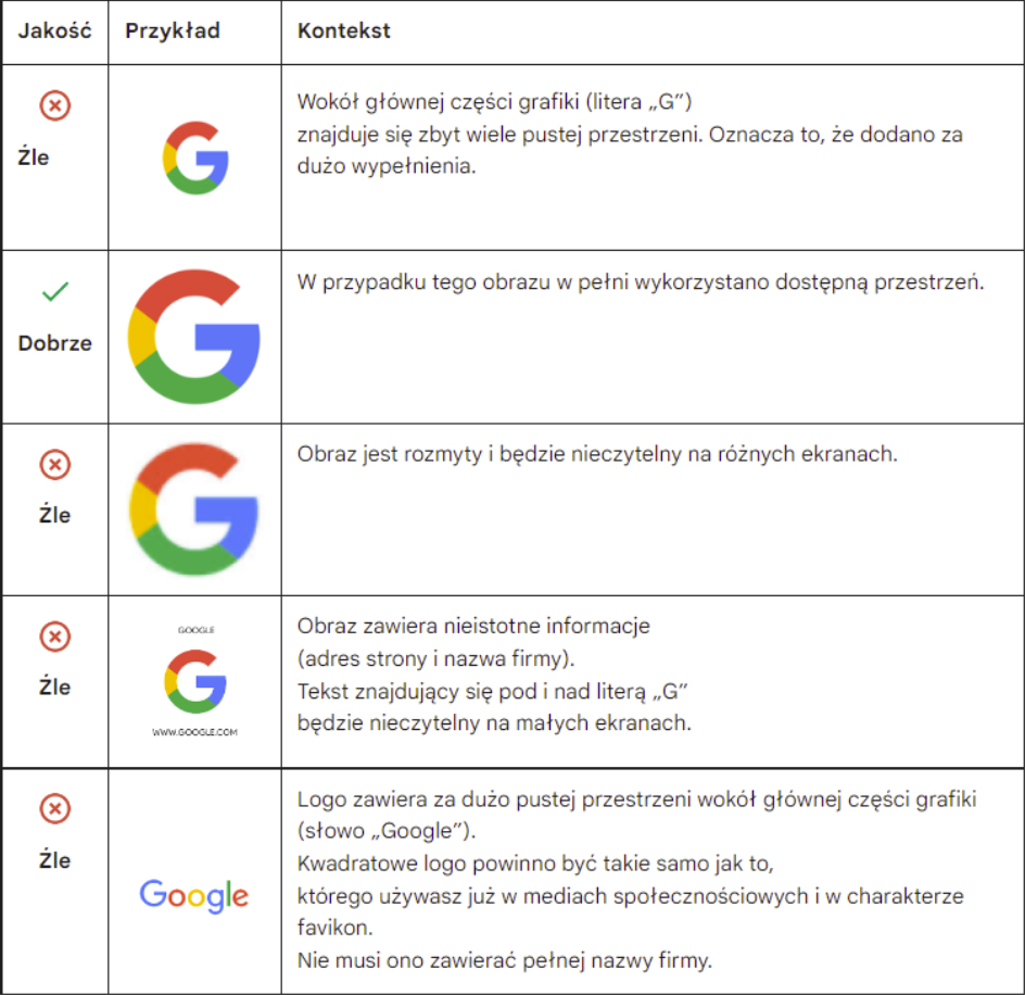 Koniecznie zwróć uwagę na przykłady na zrzutach ekranu poniżej - Google bardzo restrykcyjnie podchodzi do logo. Jeśli zostanie źle wykadrowane, w innym formacie