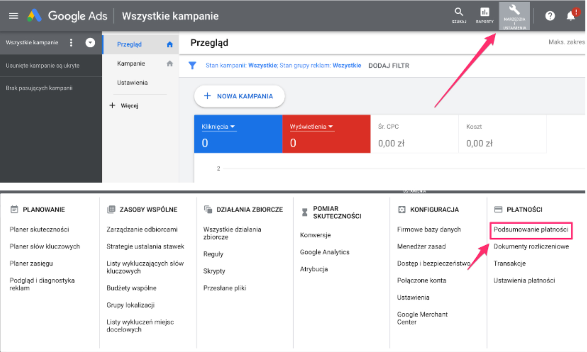 - Kliknij ikonę “narzędzia i ustawienia” w interfejsie Google Ads w prawym górnym rogu strony i z menu znajdź kolumnę “Konfiguracja” a w niej wybierz: