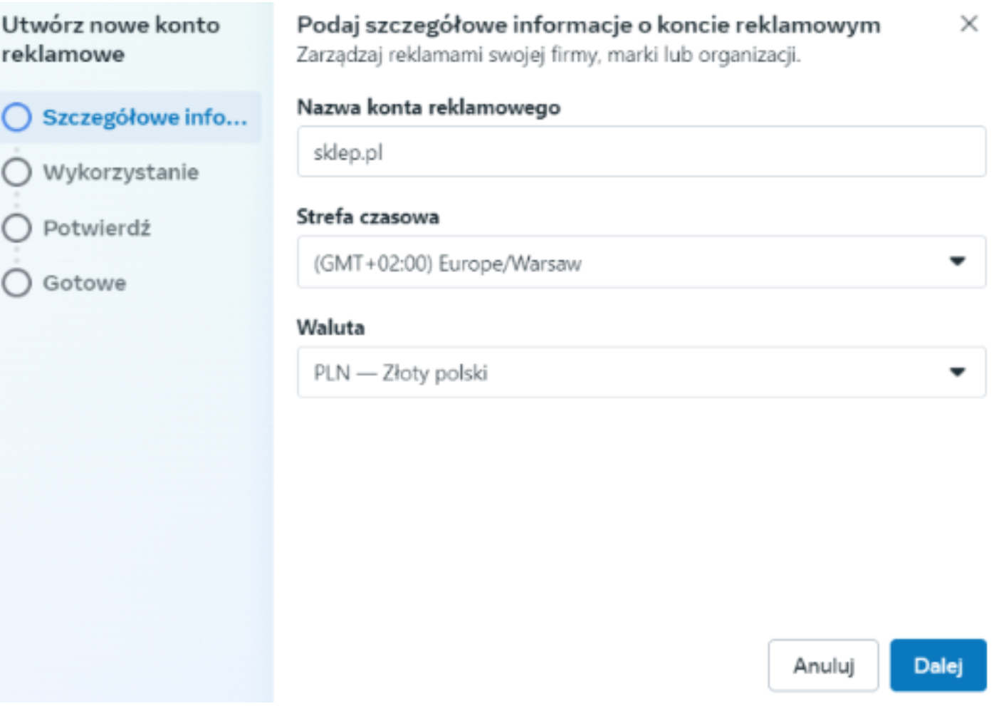 5. Nadaj nazwę konta reklamowego oraz wybierz strefę czasową i walutę.