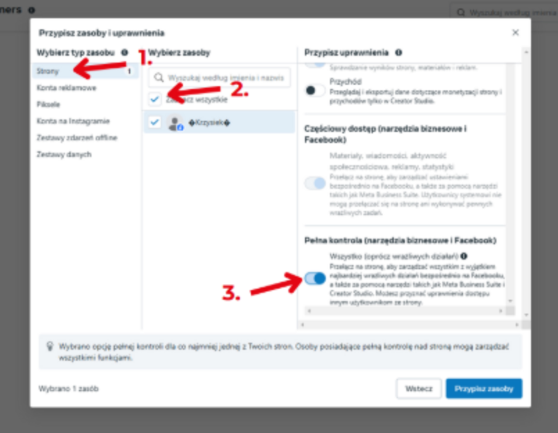 6. Teraz po kolei nadaj nam dostępy do każdego z zasobów/zakładek po lewej stronie (jeśli nie posiadasz niektórych, to pomiń tę zakładkę). Kliknij „Zaznacz wszystkie” (lub wybrane zasoby, jeśli jest taka potrzeba), a następnie wybierz ,,Pełna kontrola”.