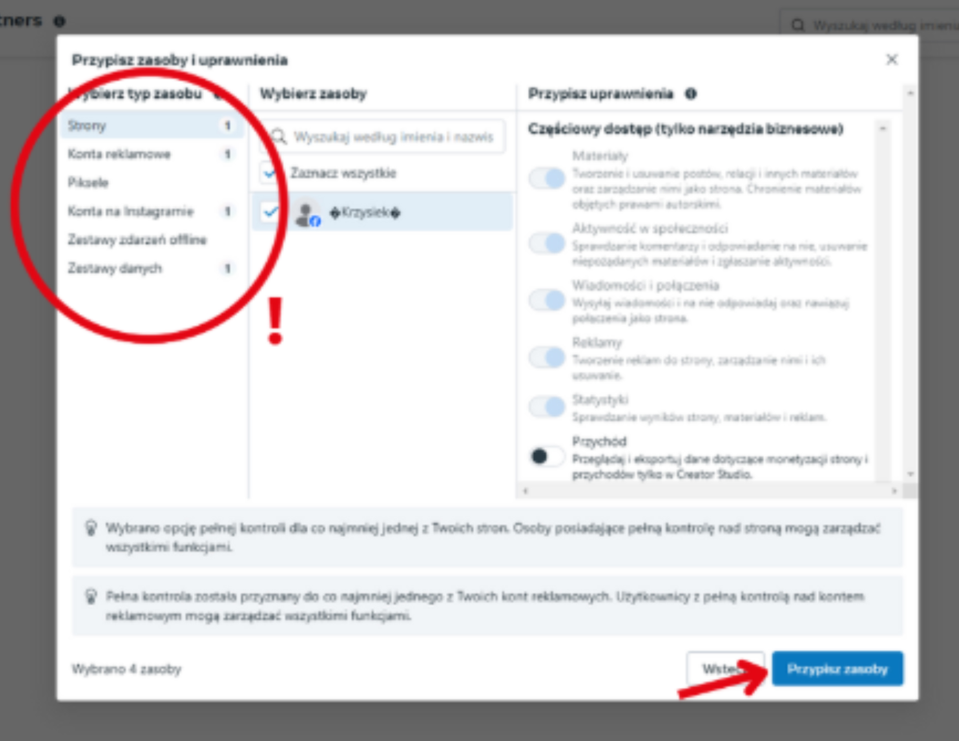 7. Upewnij się, czy wszystkie dostępy są nam poprawnie nadane i kliknij „Przypisz zasoby”.